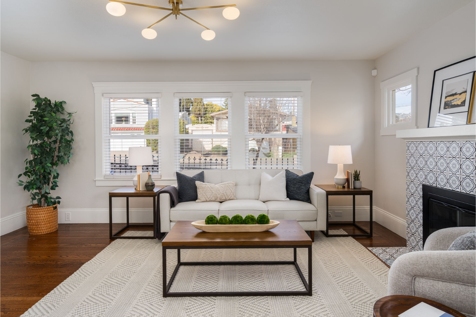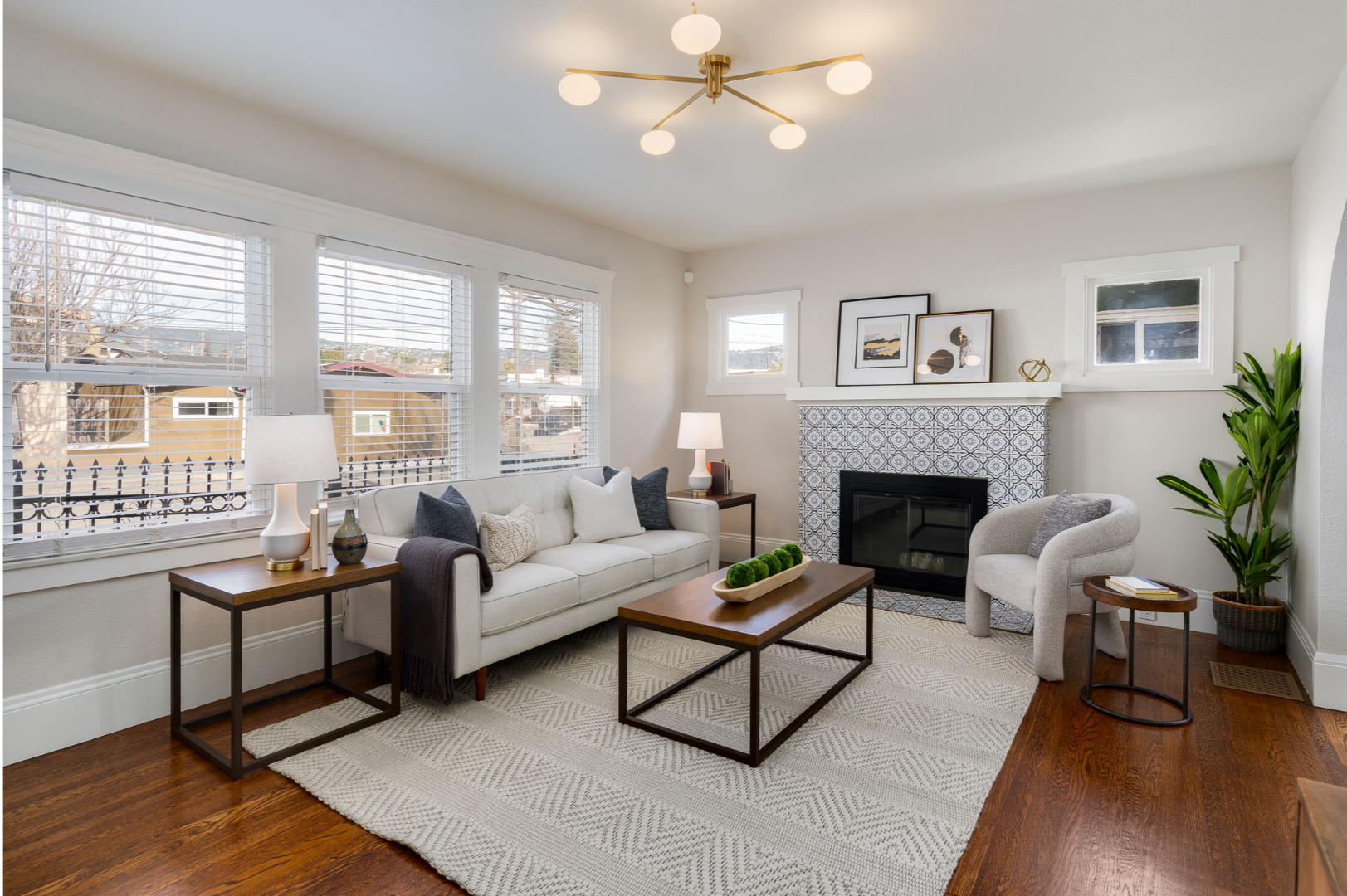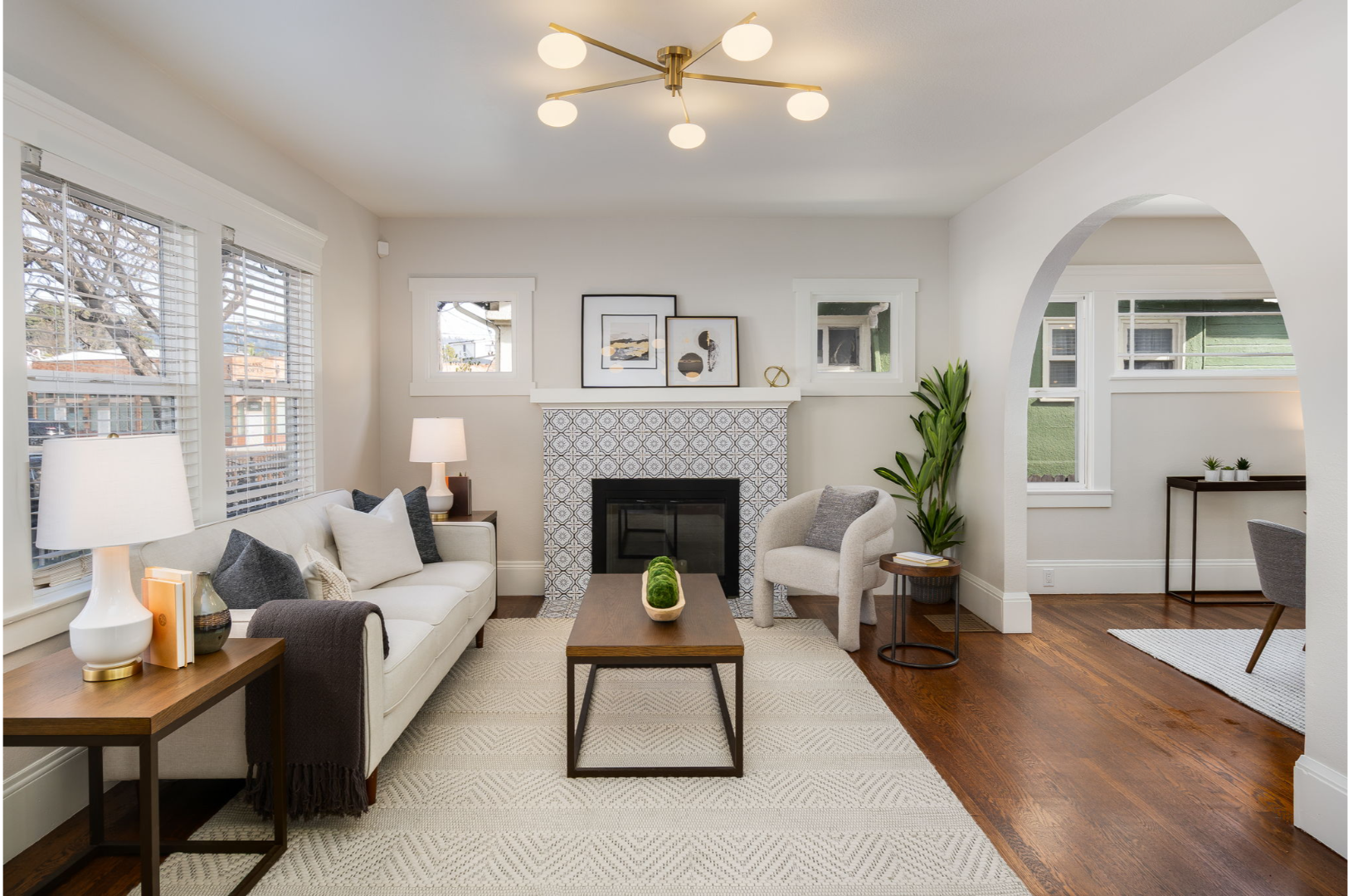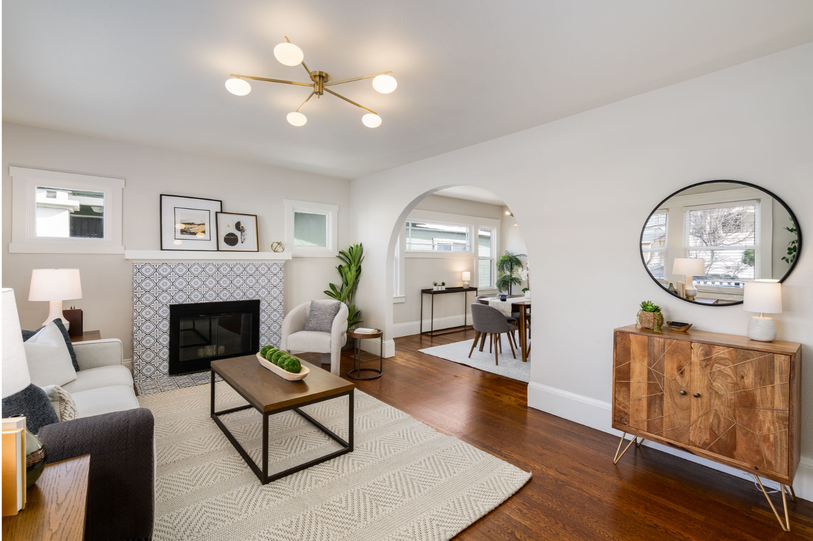Step inside to a bright and inviting living room featuring a stylish tiled fireplace, modern lighting, and the warmth of original hardwood floors that continue through the dining room and two of the bedrooms.