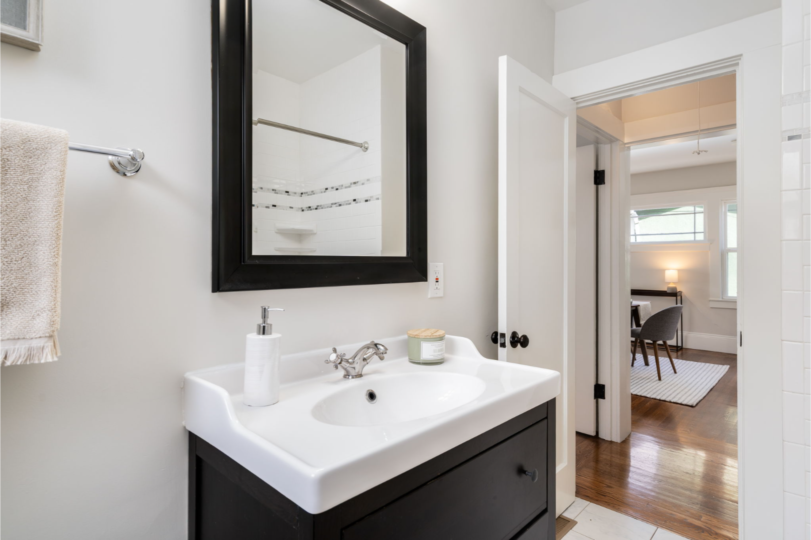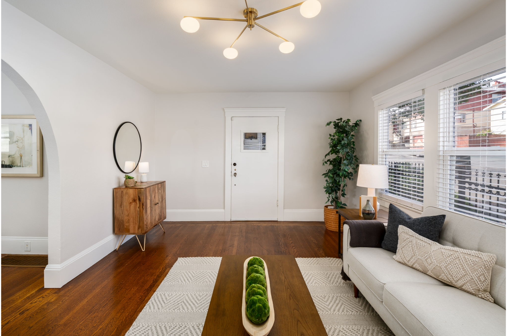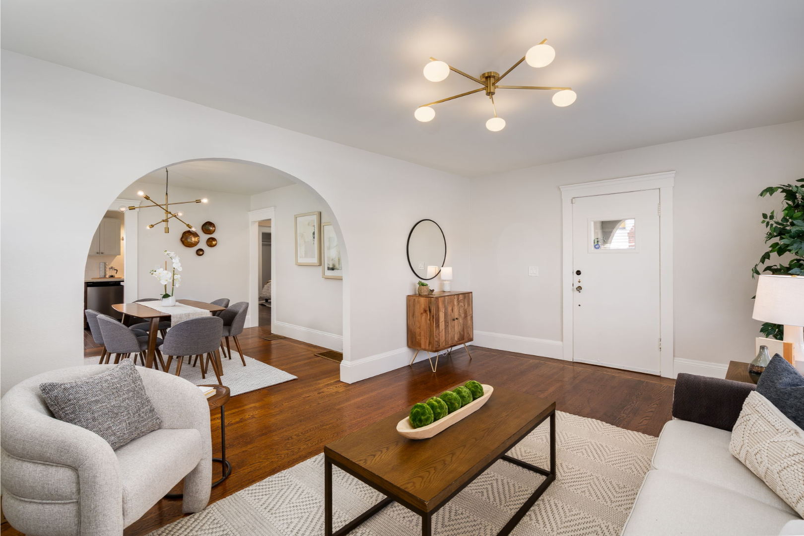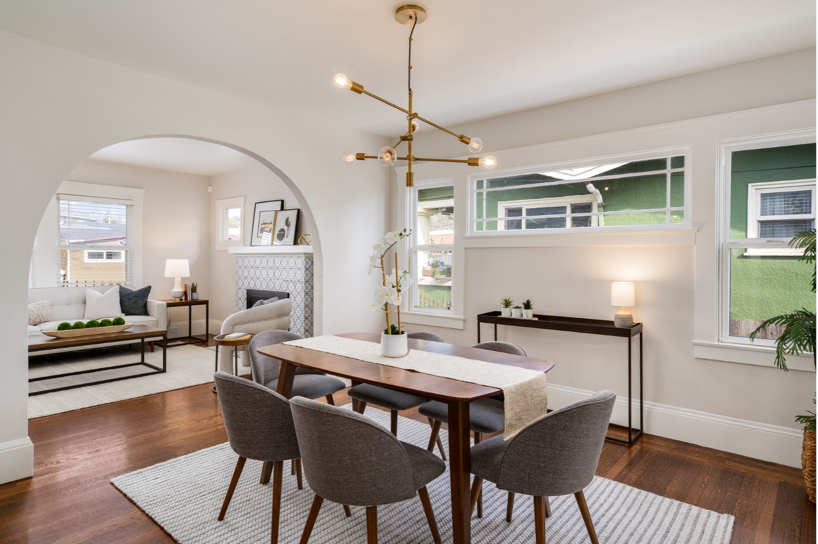 Step inside to a bright and inviting living room featuring a stylish tiled fireplace, modern lighting, and the warmth of original hardwood floors that continue through the dining room and two of the bedrooms.