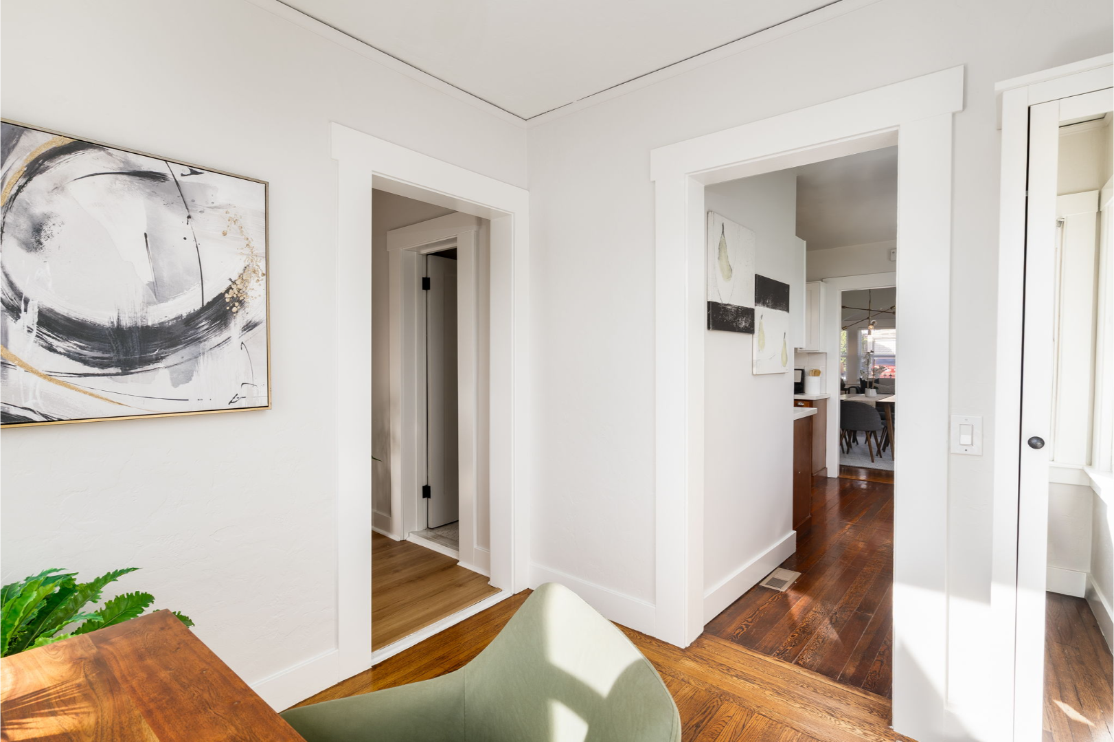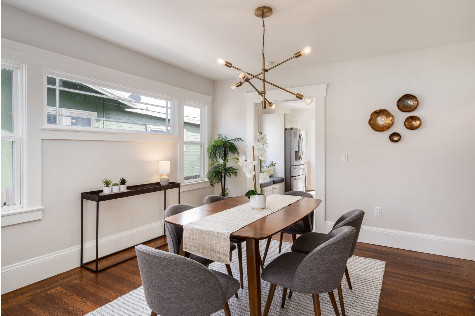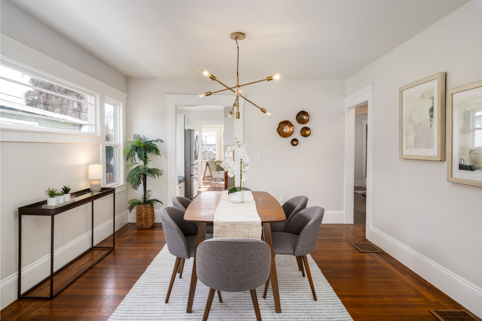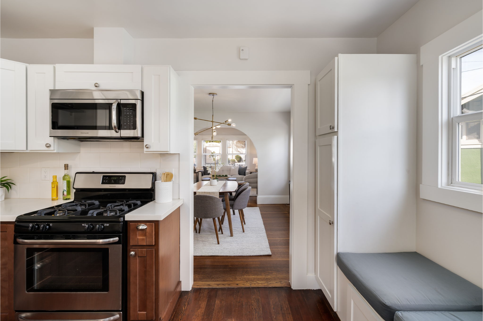 The formal dining area, complete with a contemporary chandelier, flows easily into the updated kitchen with shaker cabinets, stainless steel appliances, and plenty of workspace. Just beyond the kitchen, a sunny nook offers flexibility—use it as a breakfast spot, home office, or creative corner overlooking the spacious backyard.