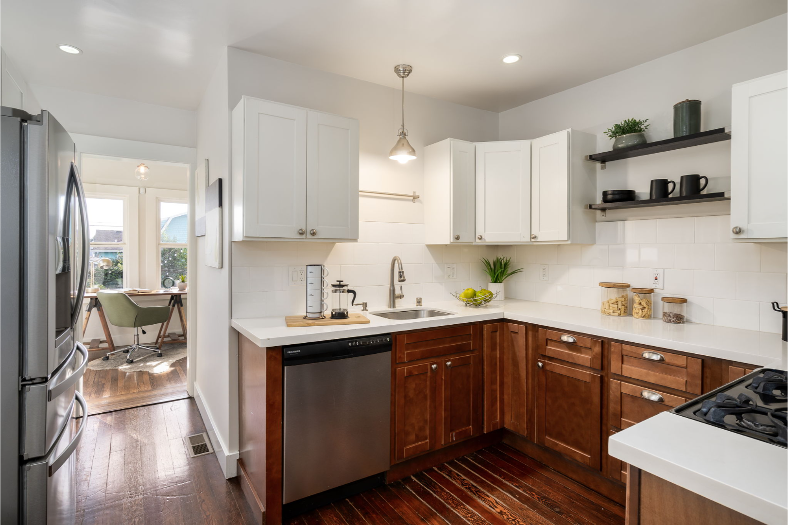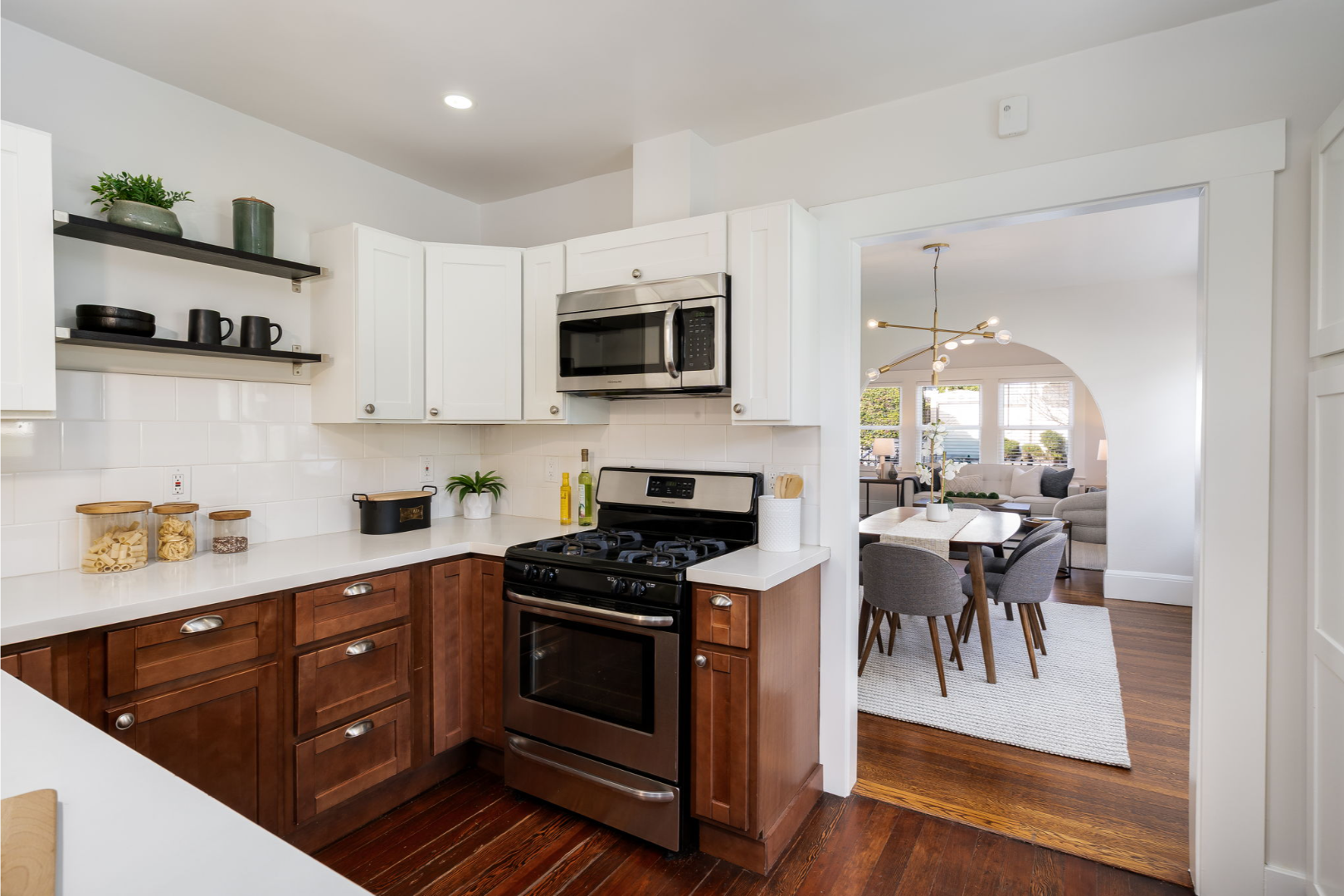 - Updated kitchen with two-tone shaker cabinets, quartz countertops, tiled backsplash, and stainless steel appliances