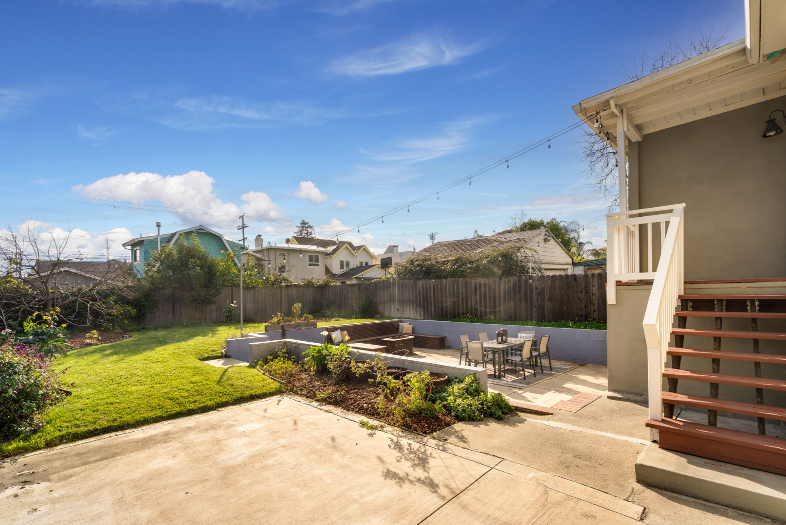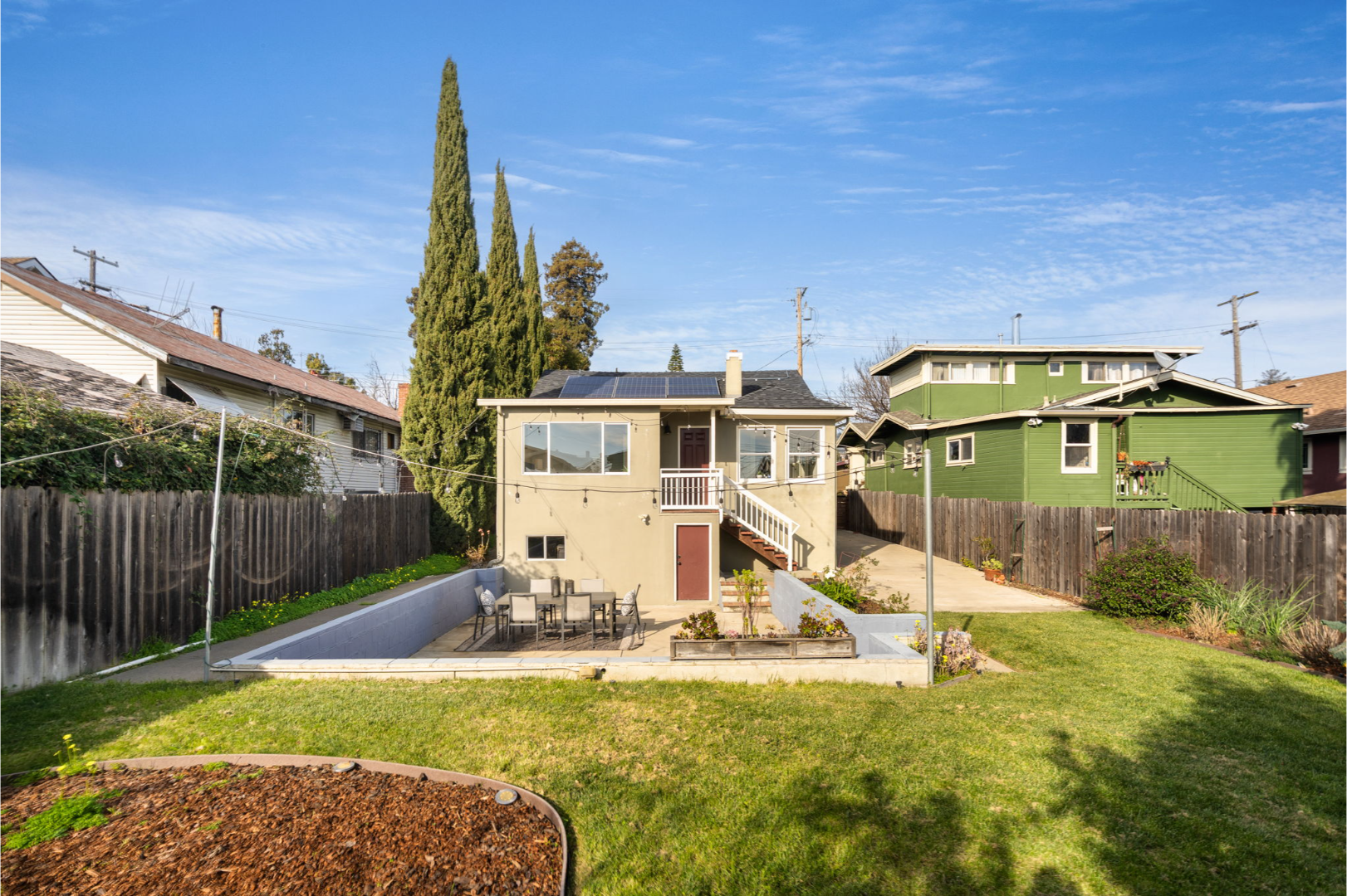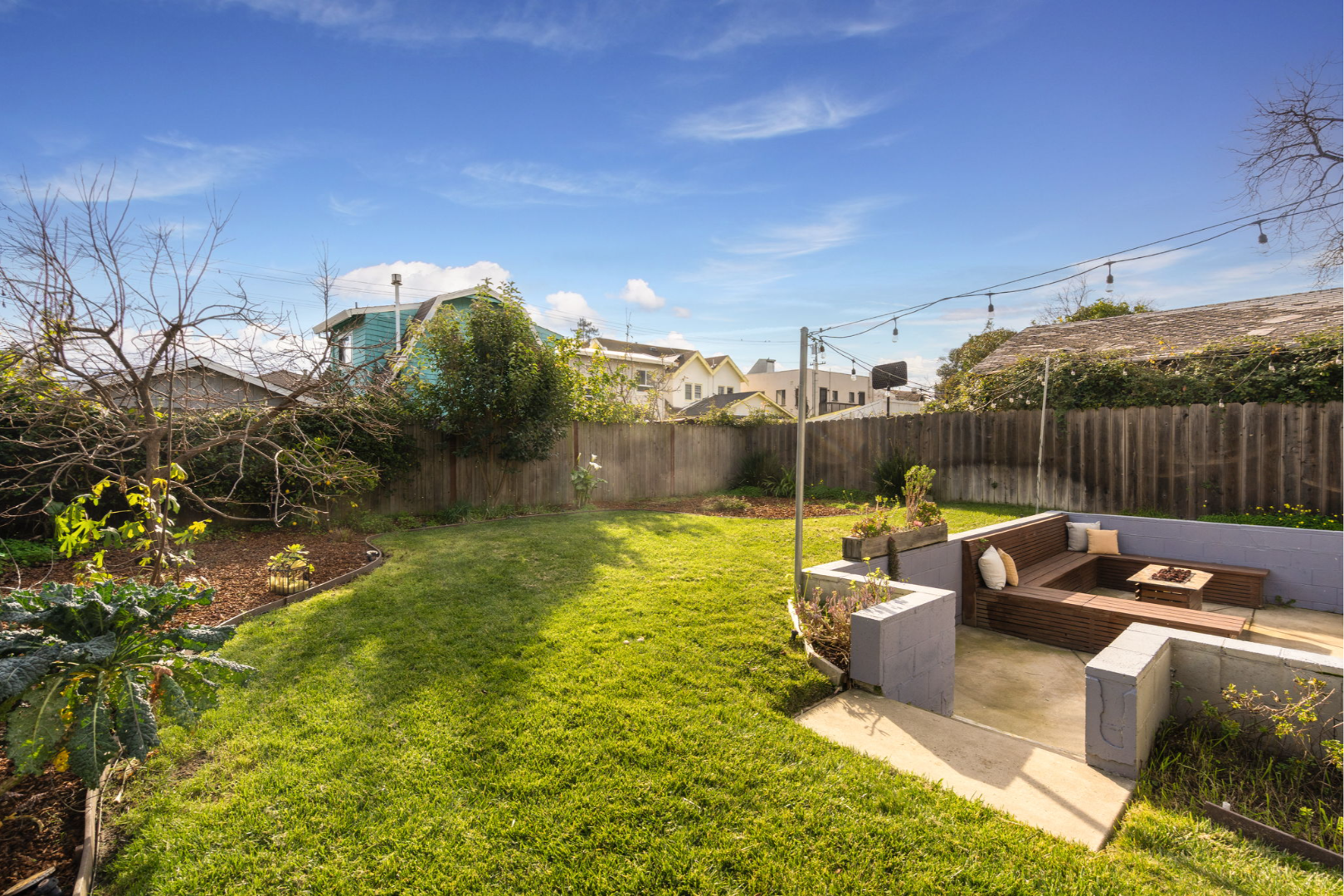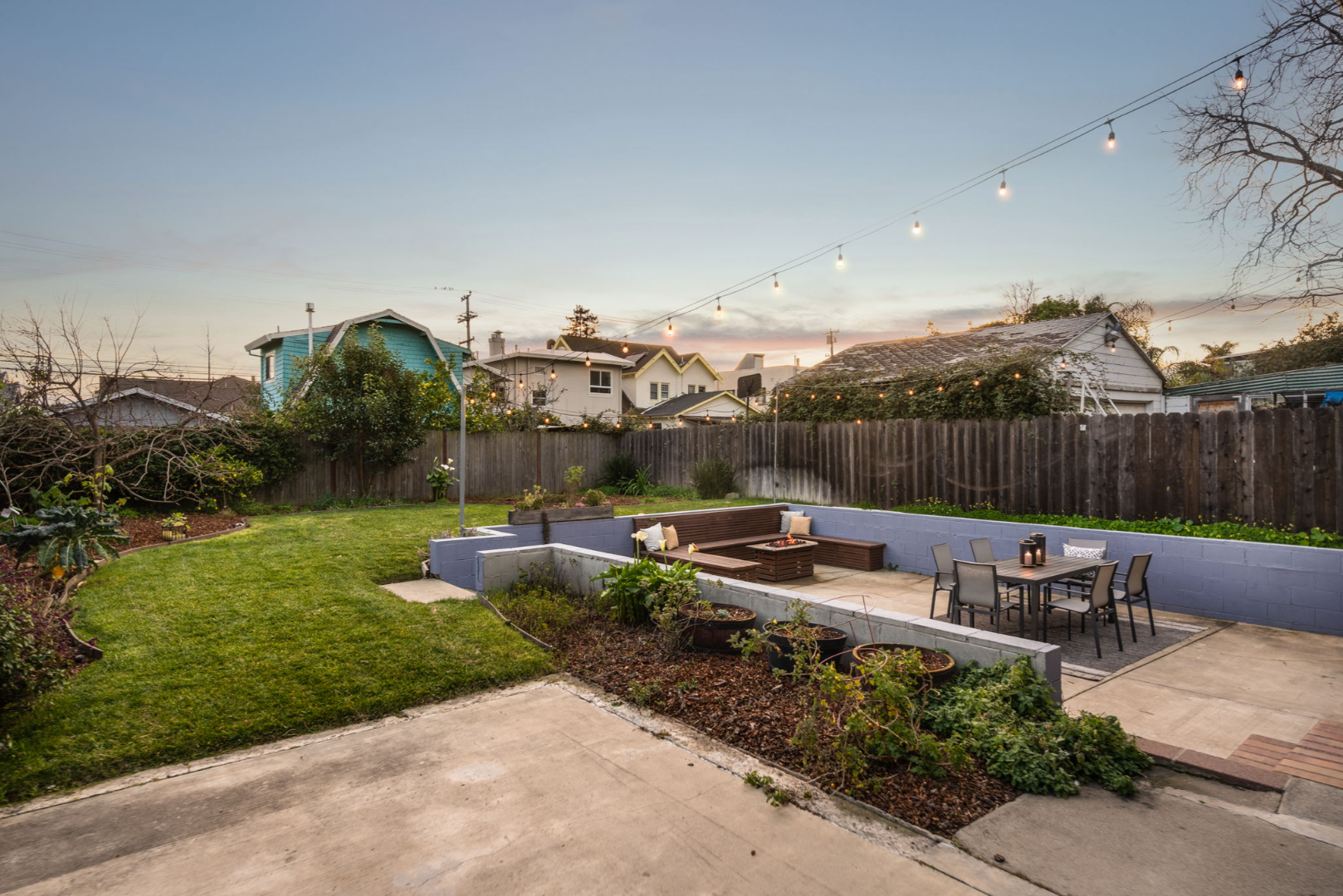 - Fully landscaped yards with lawn, seating area, and planter boxes