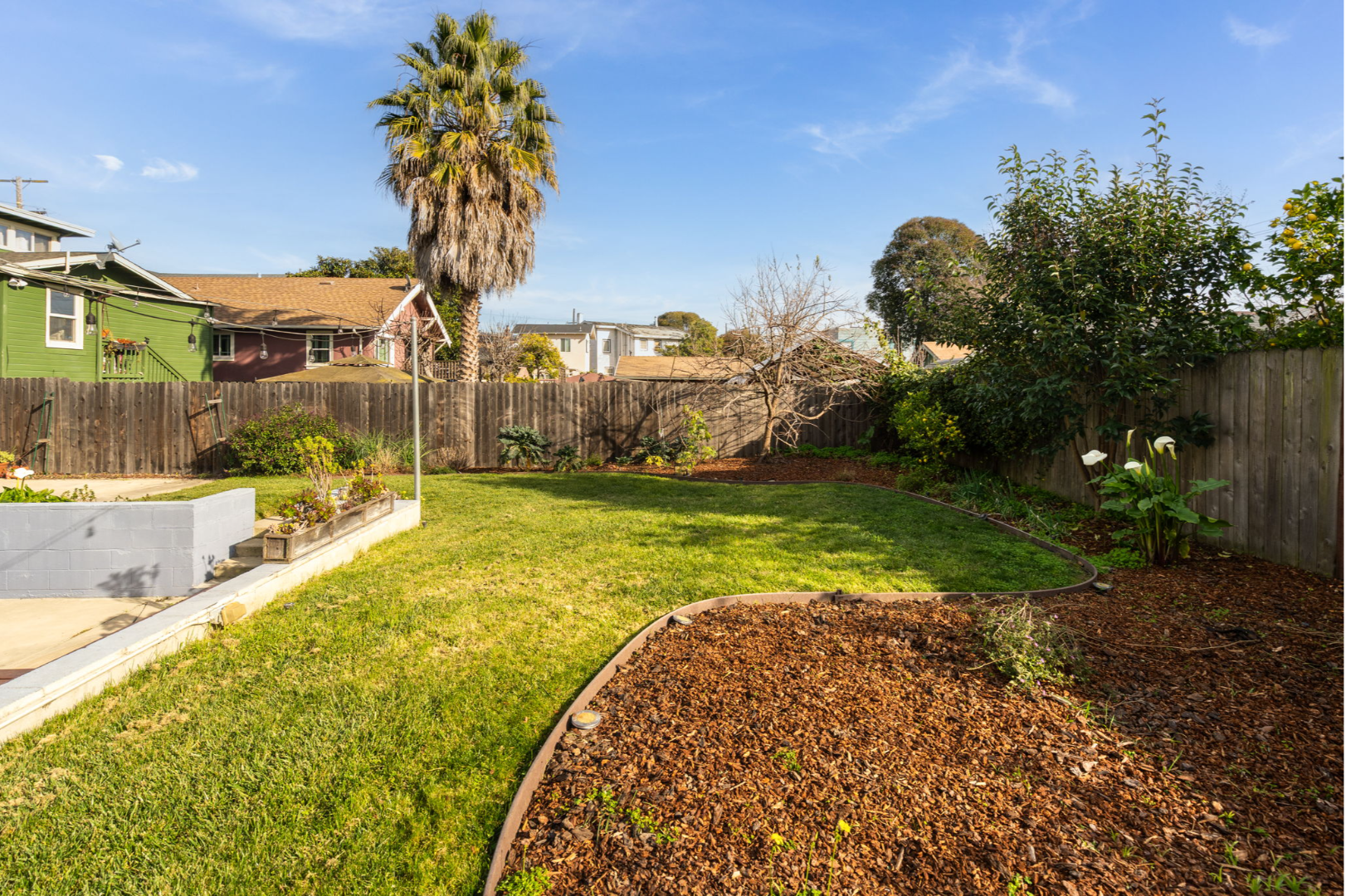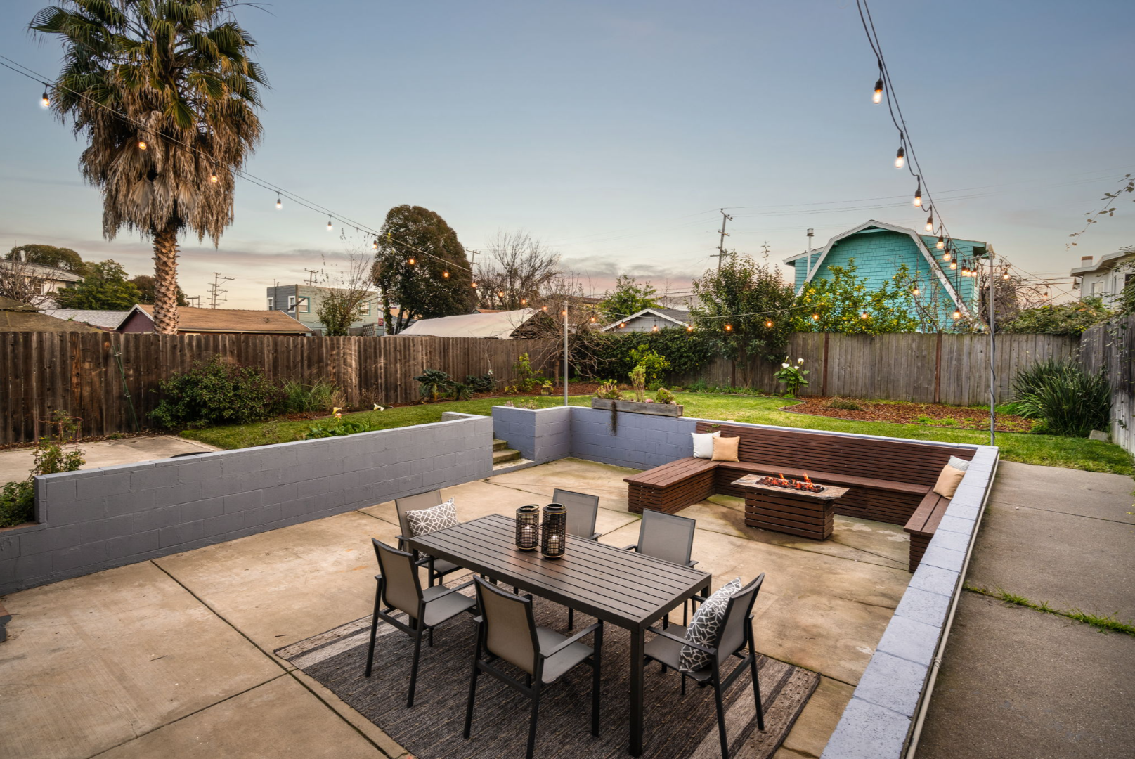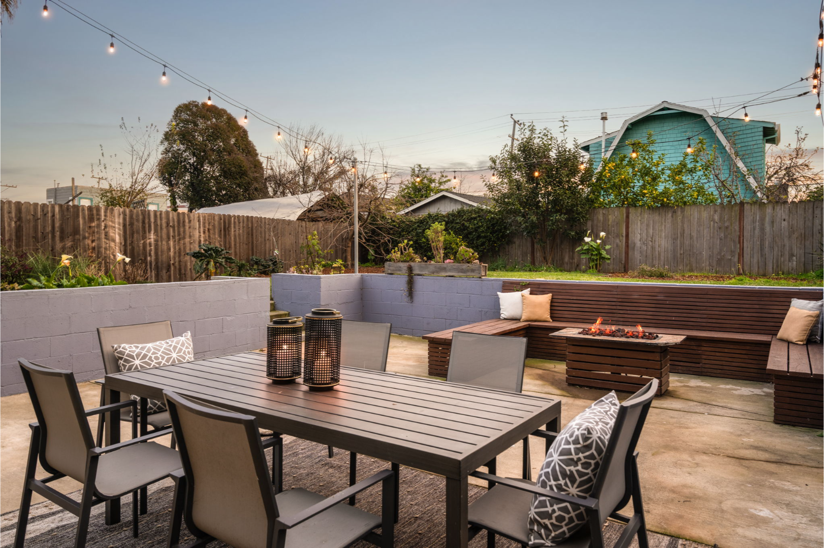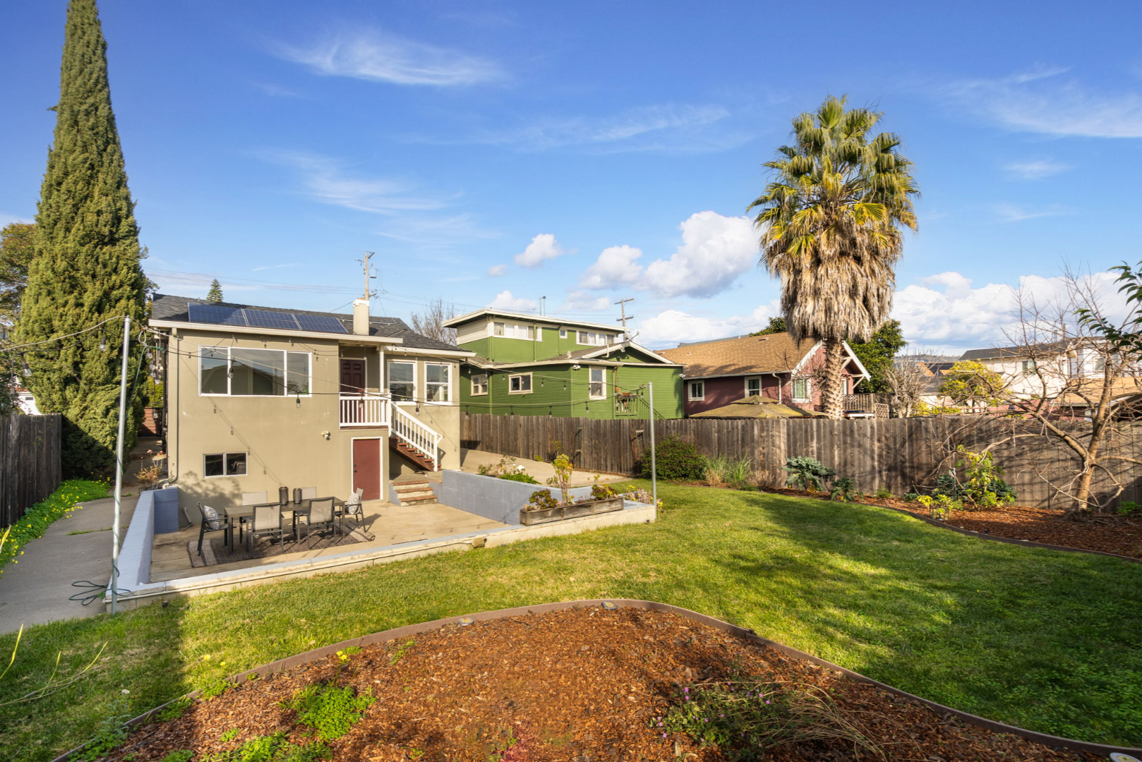 - Fully landscaped yards with lawn, seating area, and planter boxes