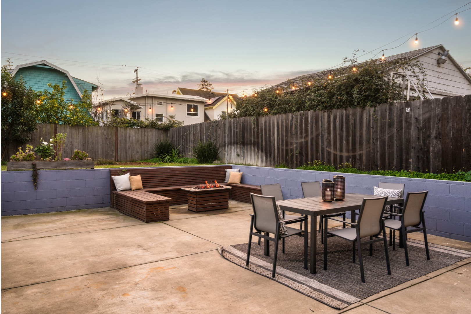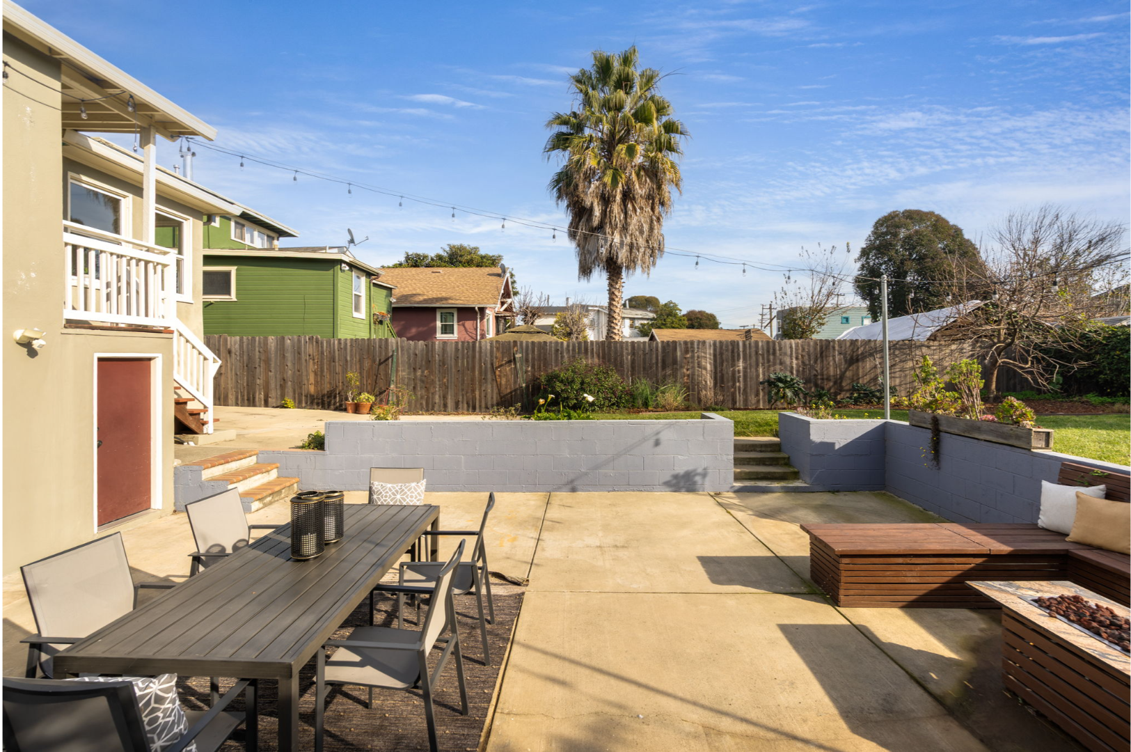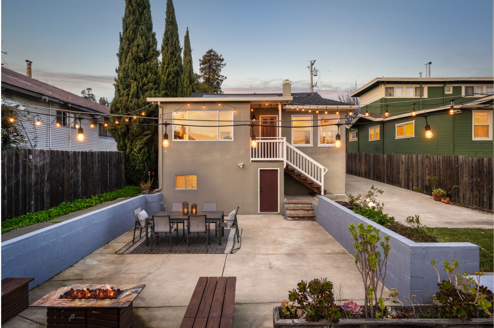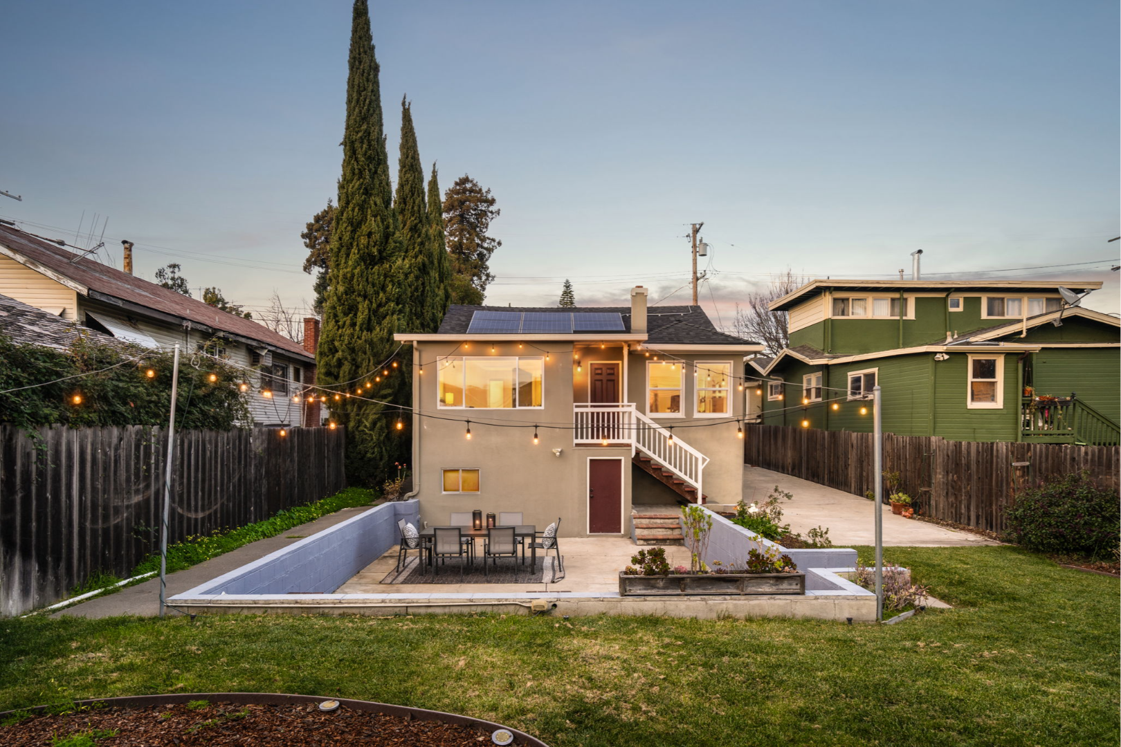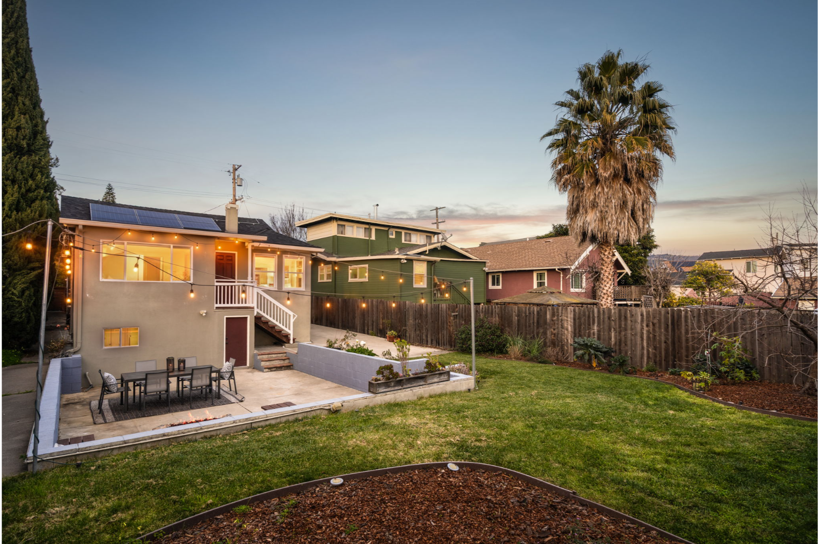 - Fully landscaped yards with lawn, seating area, and planter boxes