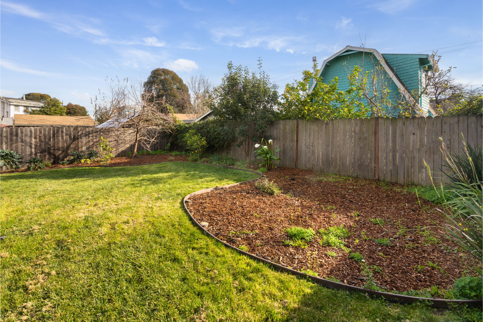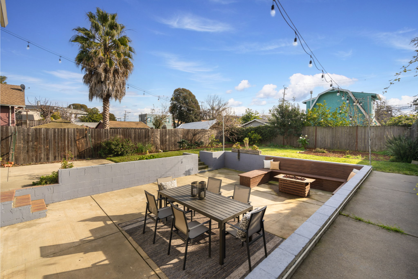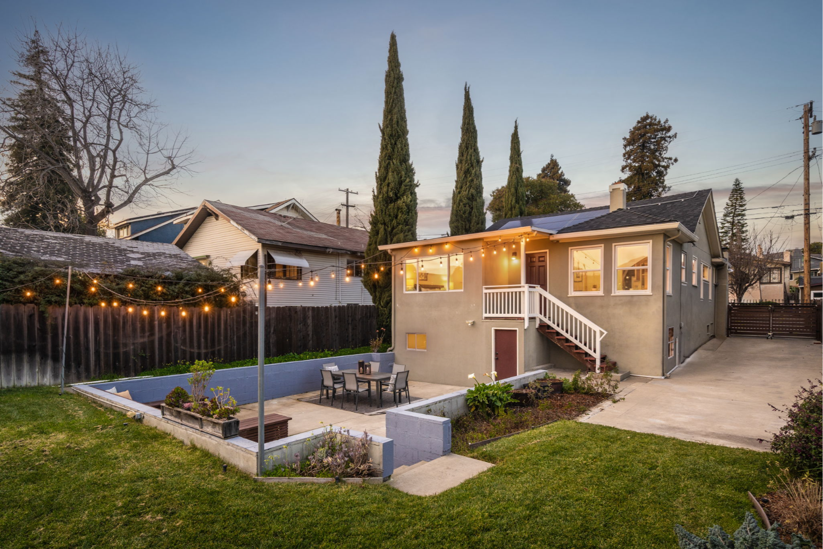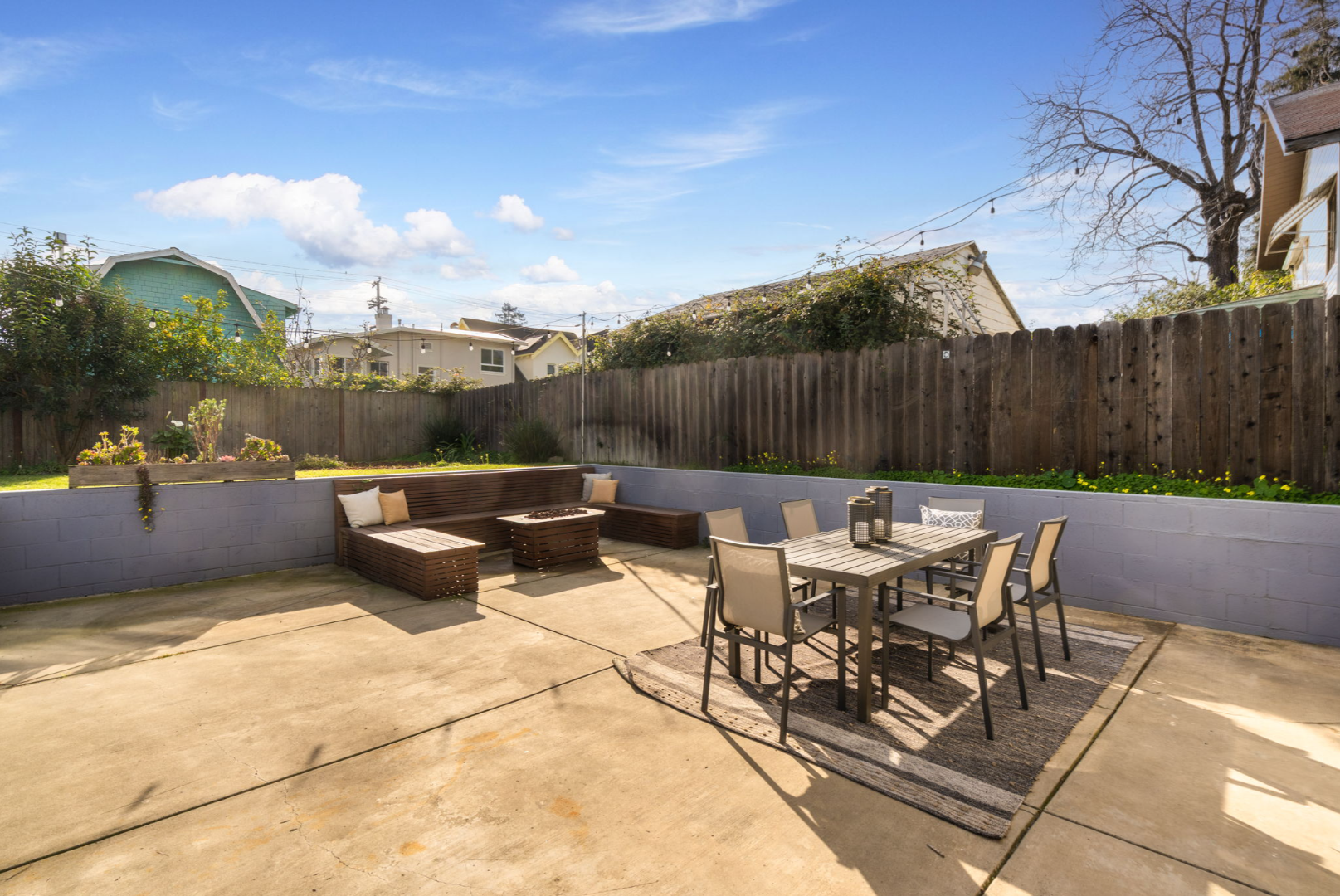- Fully landscaped yards with lawn, seating area, and planter boxes
