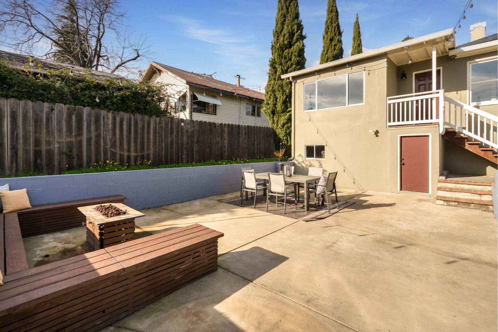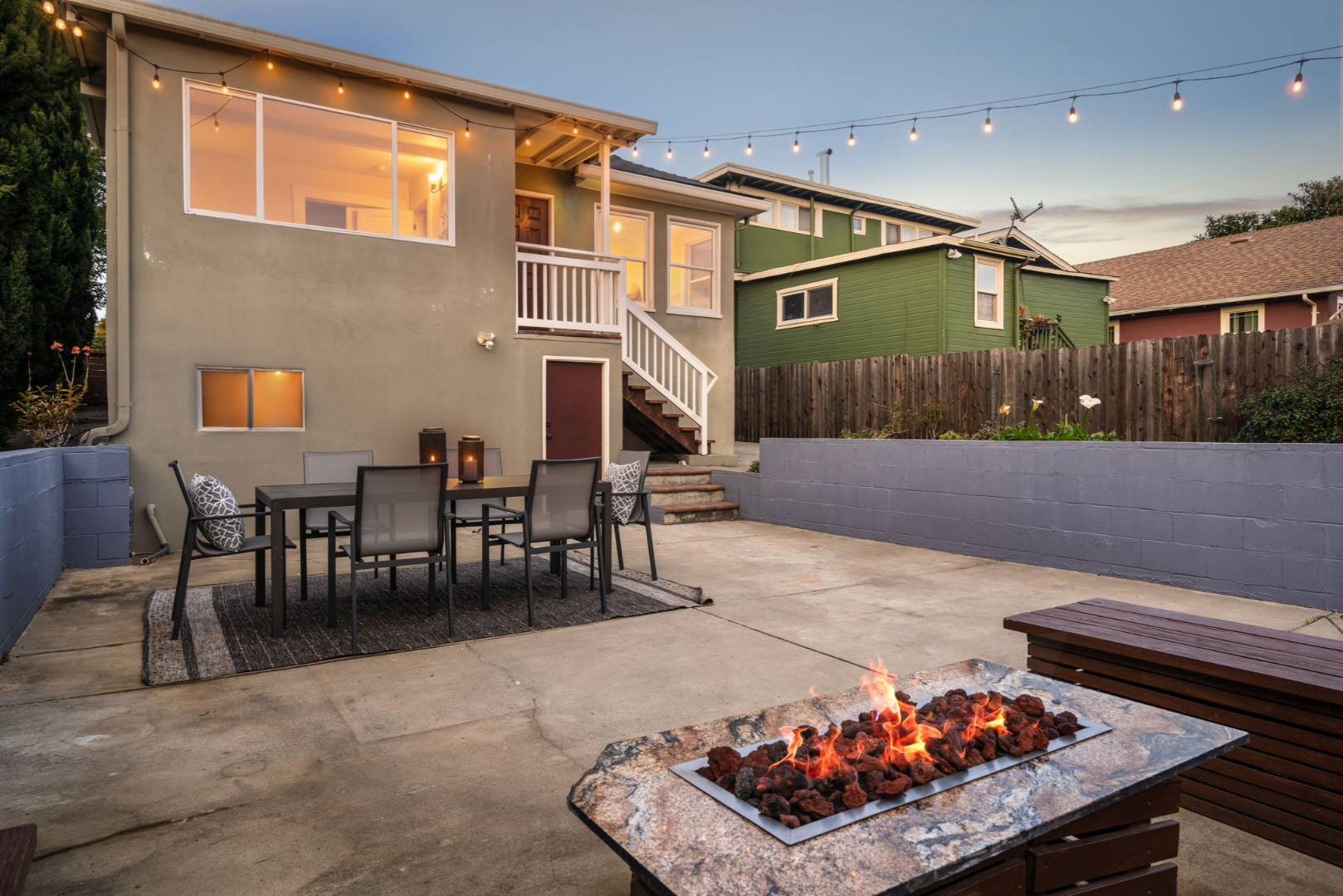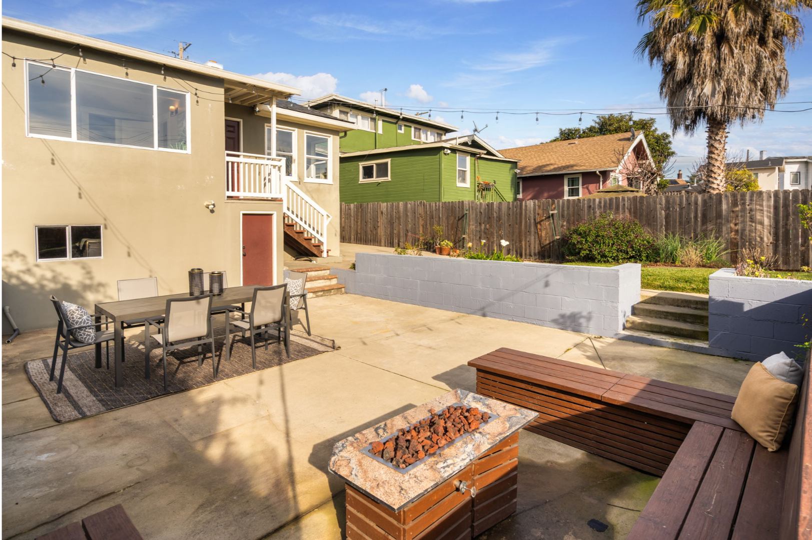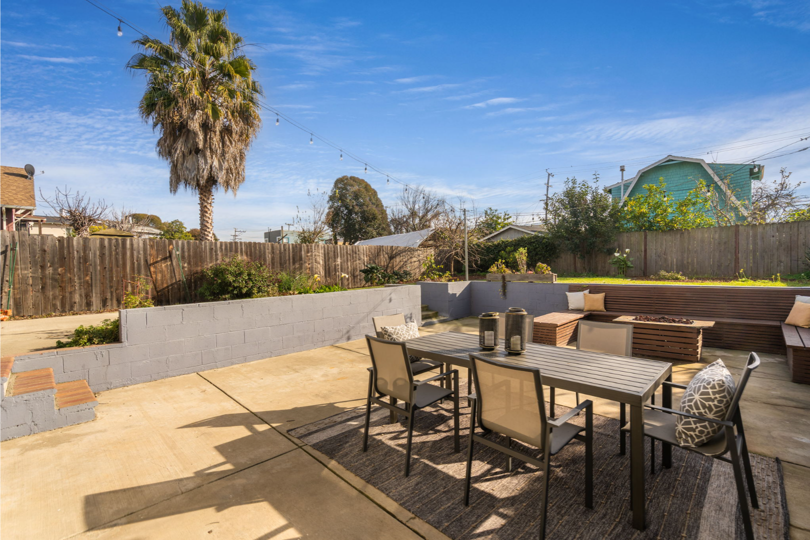 - Fully landscaped yards with lawn, seating area, and planter boxes